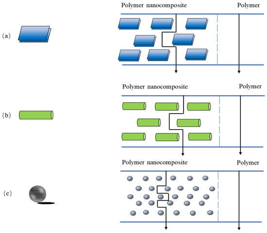 Schematic representation showing nanoparticle geometries and its corresponding tortuosity pathway in nanocomposites. (a) nanolayers, (b) nanotubes or nanofibers, (c) isodimensional nanoparticles.