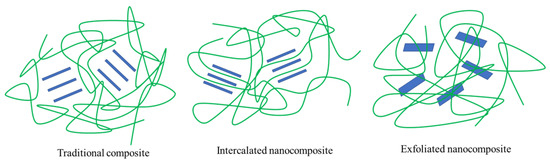 Three structural types of polymer-layered silicate nanocomposites can be obtained by physical mixing of polymer and silicate, depending on the nature of the polymer matrix, layered silicate, surfactant and processing conditions. One is that the lamellar structure of silicate keeps the original state, and nanoparticles are dispersed in the polymer matrix, representing the traditional composite material; the other is an intercalated structure formed by inserting a single or multiple extended polymer chains into silicate layers, forming an intercalated nanocomposite material. In a third case, well-separated clay layers are individually dispersed in a continuous polymer matrix to produce exfoliated or layered structures [96], characteristics of an exfoliated nanocomposite (Figure 4). The best performance enhancement in nanocomposites usually occurs in exfoliated structures. One of the most important improvements in polymers and biopolymer substrates used for packaging is the provision of exfoliated structures. MMT, with its small size, high aspect ratio, and large surface area, improves the zigzag path of diffused molecules, accounting for the improved barrier properties of the biopolymer (Figure 3).