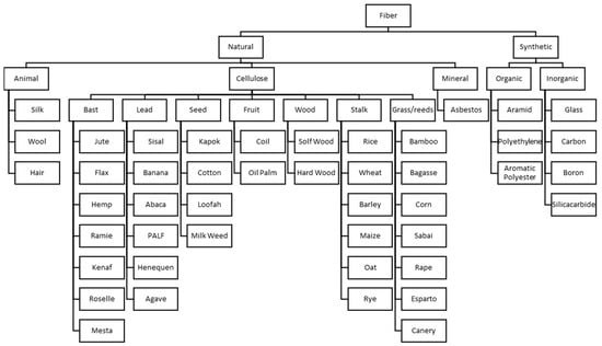 Such hybrid forms affect the weight and geometry of the advanced structural components used in specific applications [,]. Natural fibers are classified as being from flora, fauna, and minerals. Animal fiber components are typically based on proteins. Plant fibers (PFs) primarily comprise stem, leaf, root, wood, and straw which contain lignocellulose. Artificial fibers, however, are materials with synthetic chemical content and are obtained from fossil sources such as petroleum or coal []. Figure 1 shows the classification of fibers with examples [].
