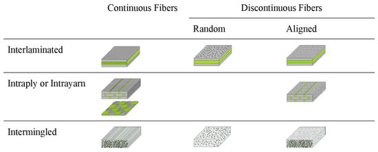 The orientation of the fibers used for reinforcement in composite materials and the manufacturing processes used significantly affect the resulting mechanical properties. Therefore, the fiber orientation and textile processes used are critical when designing hybrid composites. Polymers are widely used as matrix materials in hybrid composites []. Discussions on matrices for composites are beyond the scope of this review.