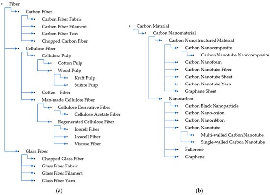 (a) Fiber taxonomies and (b) carbon nanomaterial classification used in this review.