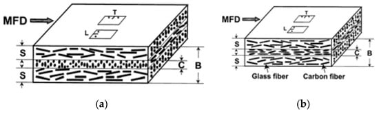 Schematic illustration showing the three-layer structures for (a) single-additive and (b) hybrid composites with GFs/CFs [].