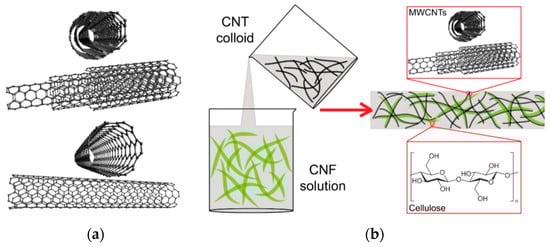 Scheme of (a) multi-walled and single-walled CNTs and (b) the preparation and structure of nanocellulose/CNT composites [].