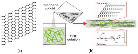 Graphene is a 2D sheet of sp2-hybridized carbon atoms []. In this structure, the carbon atoms are bonded in a honeycomb form with strong bonds in one plane []. Graphene, which is an allotrope of carbon, is in a form in which carbon atoms make covalent bonds in one layer [,]. Graphene has the thickness of one atom and has various unique properties []. It is stronger than diamond, more conductive than copper, and more flexible than rubber, making it attractive for research and development []. The intrinsic mechanical properties of free-standing, single-layer graphene sheets have been measured based on nano-indentation or nano-line using atomic force microscopy. The Young’s modulus was measured to be 1 TPa, and the intrinsic tensile strength is 130 GPa. These properties make graphene the strongest material ever measured. Graphene has good thermal conductivity above 3000 W/mK. The thermal conductivity of single-layer suspended graphene at room temperature has been measured to be 3000–5000 W/mK. The optical absorption of graphene is πα ≈ 2.3%, and it can sustain extremely high densities of electric current [,,,]. A schematic overview of graphene and CNFs is shown in Figure 7.