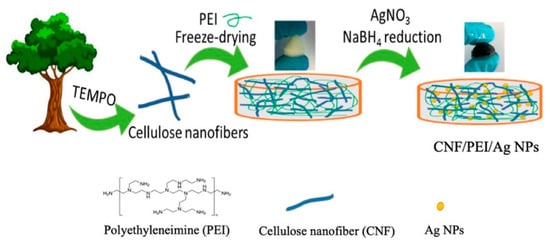 - Errokh, A.; Magnin, A.; Putaux, J.L.; Boufi, S. Hybrid nanocellulose decorated with silver nanoparticles as reinforcing filler with antibacterial properties. Mater. Sci. Eng. C 2019, 105, 110044. [Google Scholar] [CrossRef] [PubMed]