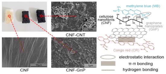- Yu, Z.; Hu, C.; Dichiara, A.B.; Jiang, W.; Gu, J. Cellulose Nanofibril/Carbon Nanomaterial Hybrid Aerogels for Adsorption Removal of Cationic and Anionic Organic Dyes. Nanomaterials 2020, 10, 169. [Google Scholar] [CrossRef]