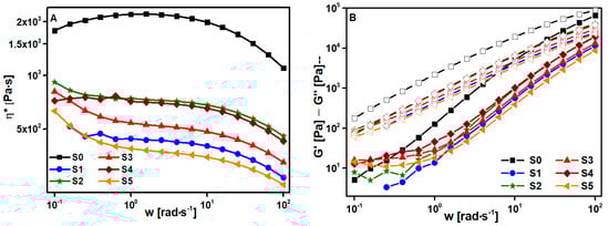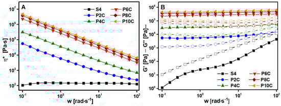 The loss modulus replicated the same behavior as G′ modulus. The S4 sample shows liquid-like behavior (G″ > G′). A crossover point is visible for P2C at a high frequency of around 70 rad∙s−1 changing the G″ > G′ behavior before this frequency to G′ > G″ afterward. The rest of the samples show a solid behavior (G′ > G″) during the whole frequency range indicating that the percolated net is totally formed [53]. The conductive network increased the number of interfaces through nanotubes, increasing the elastic response (solid-like behavior) together with an increase in energy dissipation component (G″), which explains the increase in both moduli.