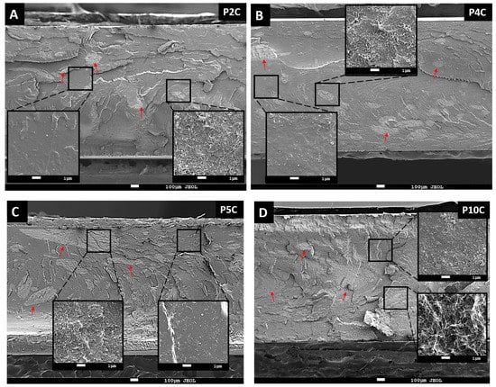 The microstructure of PLA/MWCNT composites was studied by SEM. Some MWCNT agglomerates are displayed in micrographs (see red arrows in Figure 3). Their number and size increased with the nanofiller amount, as can be seen in Figure 3. In addition, all micrographs show MWCNT agglomerates and smooth areas with individual and dispersed MWCNT, which connect the different agglomerates giving rise to an electrically conductive network (inset images in Figure 3) [49]. This effect is clearly shown in Figure 3C. The P5C composite developed well-connected agglomerates with individual MWCNT. When the filler amount increases, the differences between the agglomerates and its smooth zone are not so easily discernible (see insets in Figure 3D). This could be evidence that the electrical percolation has already occurred.