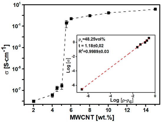 Figure 4 represents the electrical conductivity values of composites as a function of MWCNT content. Graphically, the electrical percolation threshold is reached between 5–5.5 wt.% MWCNT, since the electrical conductivity suffers an increment of 6 magnitude orders. Moreover, between 6–15 wt.% MWCNT the electrical conductivity value remained practically stable at 1.8 ± 0.2 S∙cm−1. The inset in the figure shows the mathematical linear adjustment to obtain the experimental value for the electrical threshold value (). The best linear fit (R2 > 0.99) was found for 8.3 vol% MWCNT (5.0 wt.%), matching with the morphological results. Last, the critical exponent is 1.2, which falls in the double dimensionality of the conductive network as previously reported in the literature (between 1.1 and 1.3) [50].