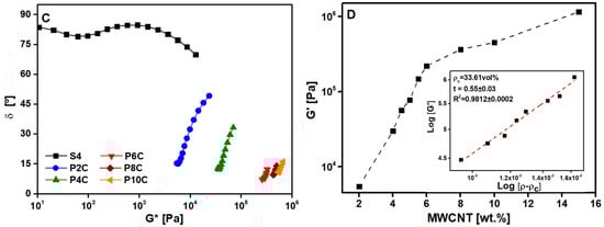 The liquid–solid transition can be observed too at the van Gurp–Palmen graph [54] (Figure 5C) which plots the phase angles (δ) against the complex moduli (G*). S4 values were near to 90 ° (the material was totally relaxed), but MWCNT addition deviated δ and the gap increased with the percentage of nanofiller. This effect showed the formation of a percolated structure in the melted sample.