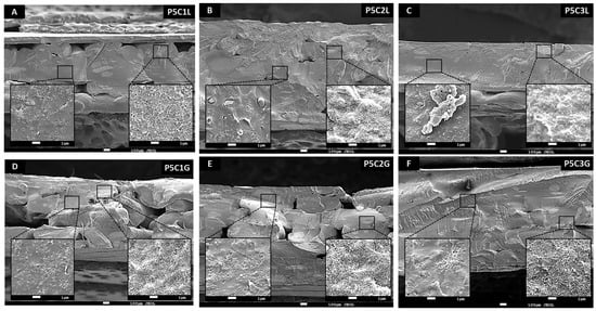 The influence of lignin and PEG in PLA/MWCNT morphology was studied by SEM. The micrographs (Figure 6) display a general view (just 40× amplification) of each sample, as well as some magnifications (5000× amplification) to see the distribution of the nanofiller within the different composites. About P5CyL specimens (Figure 6A–C), MWCNT agglomerates can be appreciated in the three samples. Within these agglomerates (inset on the left) there is a perfectly interconnected network, which provides a conductive path. In the case of P5C1L, its surface is uniform, while in samples with 2 and 3 wt.% lignin agglomerations are observed. In addition, focusing on areas that do not have MWCNT agglomerates, small groups of nanofillers (MWCNT bundles), single carbon nanotubes, and small lignin agglomerates are shown. These lignin aggregations grow as bio-additive content increases in formulations. In addition, the adhesion between layers improves with lignin since no interfaces are seen in the micrographs.