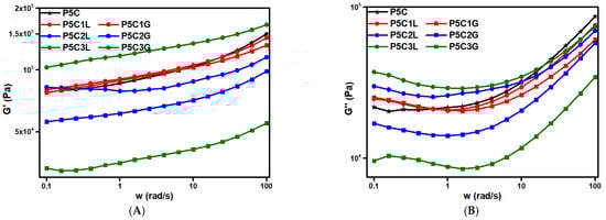 Storage modulus (G′) dependence with (A) lignin and (B) PEG addition and loss modulus dependence with (A) lignin and (B) PEG addition.