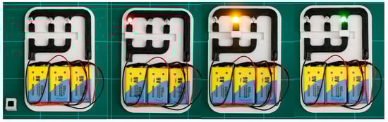 Herein, to demonstrate the superior conductive nature of this novel material, an interactive prototype with an electrically conductive filament composed of PLA and 5 wt.%MWCNT (electrical conductivity of 2.1∙10−1 S∙cm−1) was printed in a modified dual extruder Mendel Max XL v4 (Makergal, Santiago de Compostela, Spain). The prototype was processed at 210 °C with a 0.4 mm nozzle and 0.3 mm of layer height. To enhance the adhesion of the first layer of the piece, the bed temperature was set to 60 °C. The printing process was monitored in real time in order to ensure non-destructive quality control of the final piece. Concretely, the material continuity and internal density were essential to obtaining the targeted electrical conductivity, discarding the pieces that did not meet the standards. In addition, the infill option was configured with a 100% density and rectilinear pattern. Last, each part of the prototype was subjected to top superficial ironing with a 15% of flow rate and 0.1 mm of spacing between ironing passes, obtaining a smoother and better looking final product. The device has three LEDs of different colors and a selector piece (also printed in 3D) that closes the electronic circuit of each LED turning on each of them. The four states of the prototype are collected in Figure 8. Each LED requires a different voltage and intensity; therefore, the length of every individual circuit is different, and it has been calculated taking into account the resistivity of the conductive filament and the LED’s necessities. To activate the three circuits, 27V is needed.