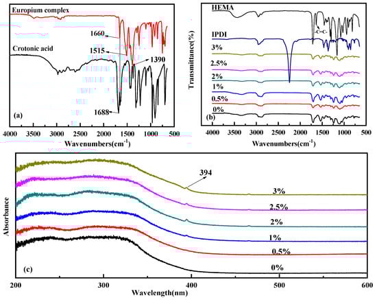 FTIR (a,b) and UV (c) spectra of the europium complex and polyurethane−europium materials with different mass contents of europium complex.