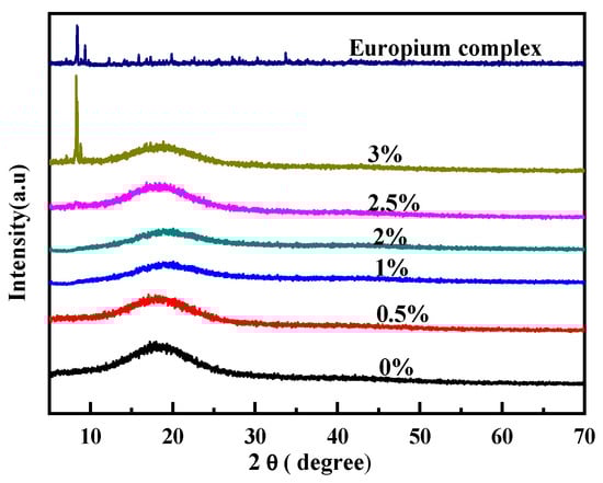 Figure 2 shows the XRD patterns of the europium complex and polyurethane–europium materials. When the mass content of the europium complex was less than 2.5 wt%, the diffraction peaks of the pure polyurethane and polyurethane–europium materials were broad and there was no obvious crystal peak. As such, the materials exhibited an amorphous state. However, when the mass content of the europium complex was increased to 3 wt%, some narrow diffraction peaks centered at about 8.4° occurred. When compared with the diffraction peaks of the europium complex, these peaks coincided with the diffraction peaks of the europium complex. This phenomenon was due to the uneven dispersion of the europium complex in the polyurethane matrix, so that the europium complex had a slight reunion phenomenon when its content increased.