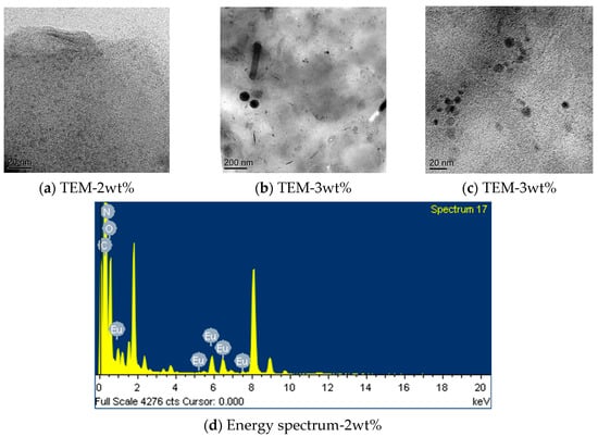 TEM images (a–c) and energy spectrum (d) of the polyurethane–europium materials containing 2 wt% and 3 wt% europium complex.