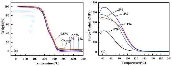 Figure 5b shows the storage moduli of the polyurethane–europium materials with different mass contents of europium complex. The storage modulus, also known as the elastic modulus, refers to the amount of stored energy due to elastic (reversible) deformation when the material deforms; it reflects the elasticity of the material. It can be seen from Figure 5b that the storage modulus of pure polyurethane decreased with increases in temperature and gradually stabilized at about 120 °C. The storage moduli of all the polyurethane–europium materials were obviously higher than those of pure polyurethane at the same temperature, indicating that the ability of the polyurethane–europium materials to store elastic deformation energy increased. When the content of the complex was less than 2 wt%, the storage modulus of the polyurethane–europium material gradually increased with increases in the content of the complex. This is mainly because the copolymerization of the europium complex and poly(urethane-acrylate) macromonomers increased the crosslinking degree and rigidity of materials, which made the material less easy to deform, resulting in an increase in the elastic modulus. However, the storage modulus decreased when the content of the complex reached 3 wt%; this was mainly due to the partial agglomeration of the complex in the polyurethane matrix. This phenomenon is consistent with results of XRD and TEM. The temperature at the inflection point of the storage modulus curve is usually taken as the glass transition temperature. It can be seen that the rare earth complex significantly increased the glass transition temperature of the polyurethane–europium material. These results show that the addition of the europium complex can improve the storage modulus and work temperature, and can widen the application range of polyurethane.