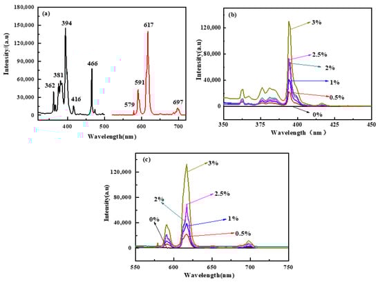 Excitation spectra with an emission wavelength of 617 nm and emission spectra at an excitation wavelength of 394 nm of the europium complex powders (a) and polyurethane–europium materials with different mass contents of europium complex (b,c) at room temperature.