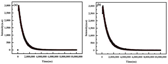 Figure 7a shows the excited state decay curve of the emission of the europium complex at 617 nm, under a 394 nm excitation wavelength at room temperature. The decay curve was fitted by a mono-exponential function(y = A1 × exp(−x/t1) + y0); the Luminescence lifetime equation was I(t) = 3482.586exp(−t/779809.482) + 2.761 and the luminescence lifetime was calculated to be 0.780 ms. Meanwhile, the luminescence decay curve (Figure 7b) of the polyurethane–europium containing 3 wt% europium complex was well-fitted by a bi-exponential function(y = A1 × exp(−x/t1) + A2 × exp(−x/t2) + y0), and the obtained fitting curve equation was I(t) = 1660.884exp(−t/920974.651) + 1660.884exp(−t/920967.633) + 10.696. The fluorescence lifetime was calculated by t = (A1 × t12 + A2 × t22)/(A1 × t1 + A2 × t2), and the obtained fluorescence lifetime of the polyurethane–europium material was 0.921 ms.