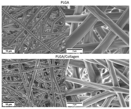 Through SEM analysis (Figure 5), it was possible to corroborate that the PLGA and PLGA/collagen scaffolds retained their integral porous structure after 7 days in PBS solution and collagenase. No signs of fractionation of the material are appreciated. This indicates that at the time of the study, the material continues to be good support for cell adhesion and guides regenerative processes. However, it is possible to observe that the fiber diameter increased from 1.0 ± 0.3 to 1.6 ± 0.4 μm for PLGA and from 0.6 ± 0.1 to 1.1 ± 0.4 μm for PLGA/collagen, which is mainly attributed to a swelling process of the fibers upon contact with the PBS solution. Sadeghi-avalshahr et al. reported that the degradation of fibers based on PLGA (75:25) (Lac:Glic) and PLGA/collagen have a degradation of 29% after 4 weeks, noting that most of the mass loss occurs in the first week, attributing the fast degradability to the presence of collagen. Usually, the degradation rate is low due to the majority proportion of lactic monomer (75), which gives it more hydrophobicity [12]. Considering these results and considering that the PLGA used has a ratio of lactic and glycolic monomers of 50:50, increasing the hydrophilic character, they could explain this swelling phenomenon [12].