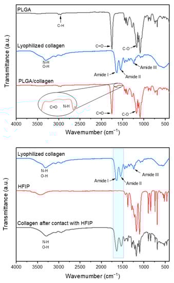 Fourier transform infrared spectroscopy (FTIR) spectra of PLGA, PLGA/collagen scaffolds, lyophilized collagen, and collagen prepared by solvent casting in HFIP.