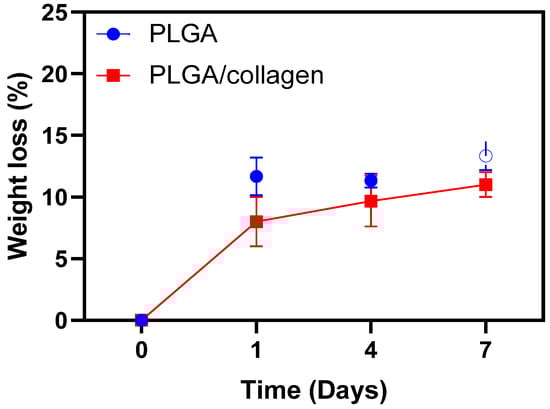 Sadeghi et al., who obtained electrospun scaffolds of PLGA coated with collagen, observed that the degradation of both PLGA and PLGA/collagen scaffolds is nearly similar. However, the weight loss of the coated collagen fibers was approximately 4.2% after 1 week, and for the non-coated fibers, it was 3.2% [45]. The authors explained that due to the low amount of collagen (ca. 2 mg/mL) in the composite, its degradation percentage is negligible compared to PLGA degradation, and the difference between both scaffolds is not significative.