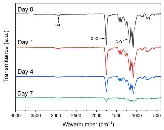 In order to understand the chemical behavior of degradation on the surface of the PLGA/collagen fibers, ATR-FTIR spectra were collected each time for up to 7 days in the presence of collagenase (Figure 6). As observed in Figure 6, a strong decrease in the peaks corresponding to amides I and II of collagen was observed by day 7, indicating a surface degradation of the collagen component of the fiber with the contact of collagenase [51]. A remarkable decrease in the peak intensity was also noted in the C=O stretching of carbonyl from the ester and C-O present in PLGA. This demonstrates that by 7 days, the surface of fibers shows the first signs of degradation. However, it is not enough time to complete the degradation of the scaffolds.