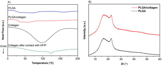 (A) Differential scanning calorimetry (DSC), and (B) XRD pattern of PLGA and PLGA/collagen. Thermograms of lyophilized and prepared by solvent casting in HFIP collagen were also shown for comparison.
