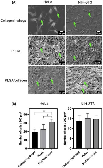 (A) SEM images of HeLa cells and NIH 3T3 attached to the collagen hydrogel, PLGA, and PLGA/collagen scaffolds for 48 h. (B) The number of HeLa cells and NIH 3T3 adhered to scaffolds. (* denotes a significant difference with a value p < 0.05, and arrows indicate the presence of cells on scaffolds).
