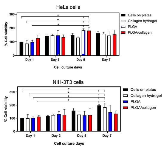 MTT test of cell viability using HeLa cells and NIH-3T3 fibroblasts on a positive control, collagen hydrogel, PLGA, and PLGA/collagen scaffolds at different exposure times, 1, 3, 5, and 7 days. (* denotes a significant difference with a value p < 0.05).