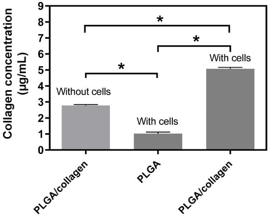 Collagen release by NIH-3T3 fibroblasts cultured on PLGA and PLGA/collagen scaffolds. As a control group, PLGA/collagen scaffolds without cells were incubated. (* denotes a significant difference with a value p < 0.05).