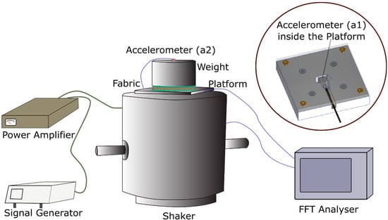 Set-up to evaluate vibration transmissibility of spacer fabrics.