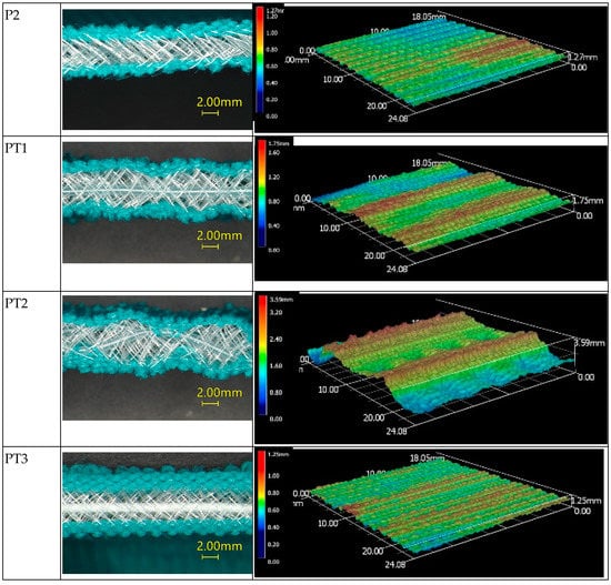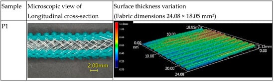 A 3D-optical microscope (VR-3000, KEYENCE, Osaka, Japan) was used to determine that the inlaying of silicone tubes into the connective layer of the spacer fabric changes the fabric geometry. The cross-sectional views and surface thickness variations of the samples are presented in Figure 2. From the longitudinal cross-section, the inlaid silicone tubes across the connective layer of the spacer fabric and its effect on the monofilament spacer yarn can be observed. The surface thickness variation can provide information about the surface evenness over an area of 24.08 × 18.05 mm2.