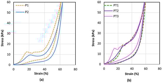 The compression properties of the spacer fabric samples are non-linear as shown in Figure 3. Spacer fabric P1 is constructed of polyester monofilaments which have a higher Young’s modulus than polyamide monofilaments. Spacer fabric P1 requires a higher stress than P2 to be compressed to the same strain. This is in agreement with Yu et al. [] that spacer fabric with polyester spacer yarn has a higher compression stiffness than that with polyamide yarn. The slopes of the stress-strain curves of both P1 and P2 start to decrease and become negative at a stress of 12 kPa and 9 kPa, respectively. The negative stiffness effect could be due to the shearing, buckling and rotating of the spacer yarns. The negative stiffness effect of PT1 and PT3 appear at a higher stress than P1 and P2. This confirms that the presence of an inlay along the connective layer can reinforce the spacer structure to withstand a higher stress. Spacer fabric PT2 consists of silicone inlaid tubes that alternatively form the front and back tuck stitches with the two surface layers, thus resulting in a more complex connective structure. This structure imparts a higher compression stiffness to PT2 in comparison to PT1 during compression up to a strain of 20% and prevents negative stiffness during compression.