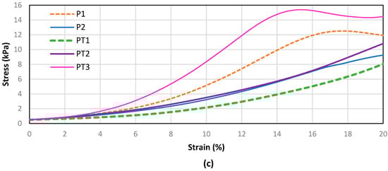 Compression stress-strain curves of (a) spacer fabric samples without inlay, (b) spacer fabric samples inlaid with silicone-based materials and (c) all of the fabric samples with a load strain up to 20%.