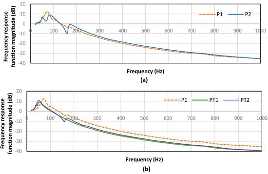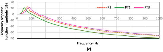 The knitting and inlay patterns of PT1 and PT3 are the same but the vibration transmissibility of the two fabrics is very different. Silicone foam materials are a porous viscoelastic polymer that is foamed from silicone rubber and commonly used as vibration isolation materials [,]. However, the inlaid silicone foam tubes in PT3 not only fail to improve the vibration isolation ability of the spacer fabric, but also impart a higher natural frequency to PT3 and a narrower band of vibration isolation than P1 (Figure 4c). The magnitude of the FRF is even higher than that of the spacer fabric without inlay for the frequency band of 80–1000 Hz. Therefore, the vibration isolation ability of the spacer fabric is increased with the inlaying of silicone hollow tubes (PT1), but reduced with the inlaying of silicone foam tubes (PT3). Silicone foam tubes with a relatively lower Young’s modulus may not be suitable to use as inlay for spacer fabric to provide vibration isolation.
