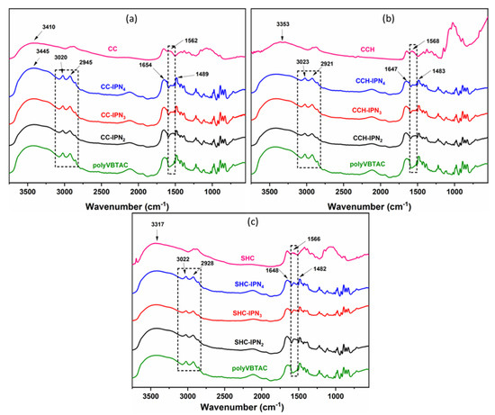 FTIR spectra of CC-IPN hydrogels (a), CCH-IPN hydrogels (b) and SHC-IPN hydrogels (c) compared to the FTIR spectra of polyVBTAC, CC, CCH and SHC, respectively.