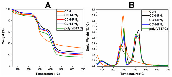 TGA (A) and DTG (B) thermograms for semi-IPN CCH-based hydrogels.