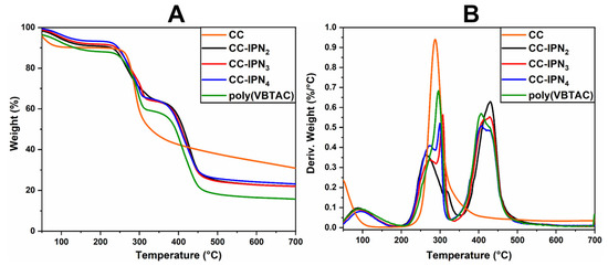 TGA (A) and DTG (B) thermograms for semi-IPN CC-based hydrogels.