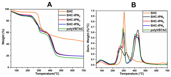 TGA (A) and DTG (B) thermograms for semi-IPN SHC-based hydrogels.