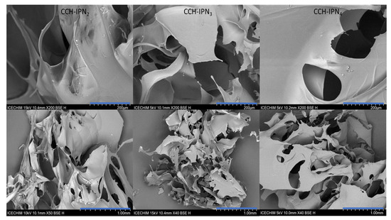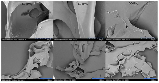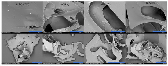 The micrographs of the lyophilized semi-IPN hydrogels from the CC and CCH series are presented in Figure 5 and Figure 6, respectively, while those of SHC-IPNs and of the simple polyVBTAC hydrogel are shown in Figure 7. The morphology of all IPNs illustrates a favorable porous structure for water adsorption. However, the morphology changes with the increase in VBTAC for all the three series of IPN, from a dense porous network (IPN2) to a compact and smooth network (IPN4) that more closely resembles that of poly(VBTAC) alone. Therefore, it can be noted that the three series of semi-IPN show a good intercalation of the compounds in the final structure due to their smooth appearance and defect-free areas.