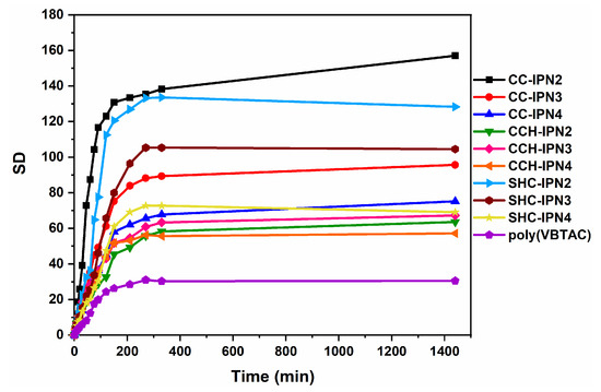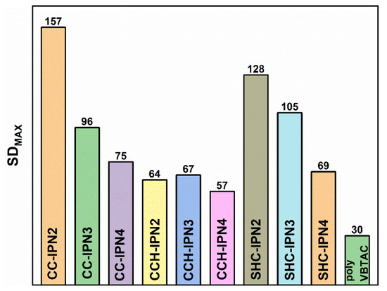 The influence of the VBTAC concentration and the chitosan type (CC, CCH and SHC) used for the synthesis of IPNs was also evaluated by determining the degree of swelling at equilibrium. Figure 8 shows a fast mass increase in hydrogels in the first 3 h after their immersion in liquid (water). In the case of polyVBTAC, in addition to the initial fast increase, the equilibrium swelling is reached much faster compared to the rest of the samples containing chitosan. Figure 9 shows the maximum degree of swelling (SDMAX) for the analyzed hydrogels. Given that semi-IPN hydrogels were synthesized using the same amount of crosslinking agent relative to the VBTAC content, it can be observed that with increasing VBTAC concentration, the SDMAX values decrease considerably from IPN2 to IPN3 and to IPN4, particularly for the CC and SHC series, thus indicating a much more compact interpenetrating structure which tends to absorb a smaller amount of fluid. An interesting swelling behavior is observed for CCH-IPNs, whereas very little differences are observed when increasing the VBTAC concentration, which can indicate a rather limited interpenetration of networks in this case [59,60].