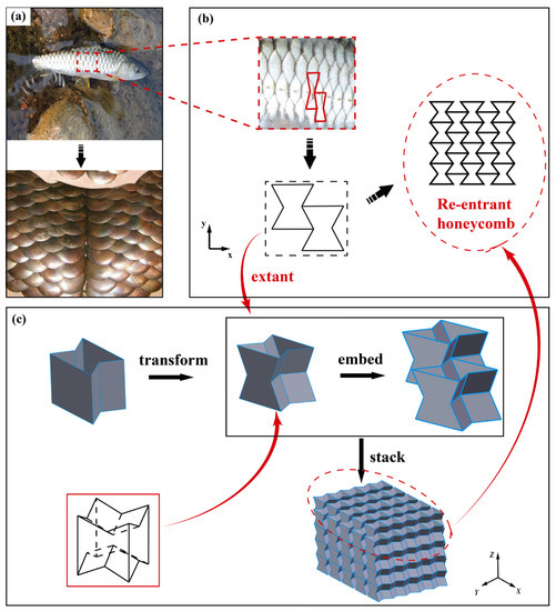 The distinctive arrangement of fish scales protects the fish’s body and enables it to move freely. Additionally, craftsmen invented fish scale armor inspired by fish scales. The whole fish scales can be regarded as formed by a periodic arrangement of re-entrant honeycombs. However, the conventional re-entrant honeycomb is a 2D construction. The 2D re-entrant honeycomb is thereby extended into a 3D structure. Referring to the arrangement of fish scales, the 2D re-entrant honeycomb has been improved. The straight side walls of the honeycomb are concave to form a structure similar to an eggshell frame, which is used to transmit the side force. The structure is seen in Figure 1. Unlike the straight walls of traditional honeycombs, the unit cells of the enhanced honeycomb are simpler to embed when stacked. Due to the material characteristics and self-locking effect induced by the unit-cell stacking approach, this newly built structure not only functions as an energy-absorbing device but also has sufficient rigidity.