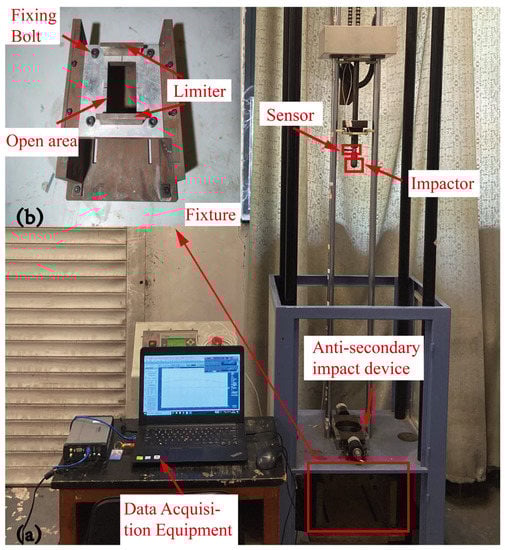 Drop-weight test system. (a) Impact test platform, (b) Fixture.