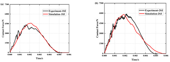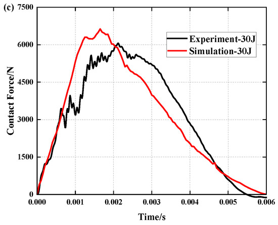 Comparison of simulation and experiment contact force histories under different impact energies: (a) 10 J, (b) 20 J and (c) 30 J.
