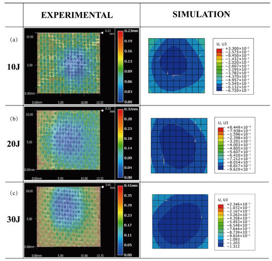 Comparison of the maximum deformation between the experiment and simulation of the honeycomb sandwich panel. (a) 10 J, (b) 20 J and (c) 30 J.