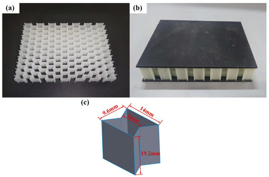 Due to the limitations of the experimental equipment, the re-entrant honeycomb core employs only two layers of unit cells to lower the structure’s height. The honeycomb core was made using SLA technology. Godart®8228 is a photosensitive resin produced by GreatSimple Technology Inc., (Zhongshan, China). After forming, the material density is 1180 kg/m3. The honeycomb specimen is depicted in Figure 3a. Three specimens were printed, each measuring 19.2 mm in height and 0.5 mm in wall thickness. The relative density of the honeycomb core is 0.1421. The experimental specimens were prepared to the ASTM D7766/D7766M-11 standard [40]. To improve the impact resistance of the face sheet, CFRP panels are utilized. The CFRP panel produced by China’s Weihai Guangwei Composite Material Co., Ltd. has a carbon fiber model of T300 and a matrix model of 7901. The matrix is an epoxy resin. The CFRP panel has a [0/90]5 layering method, a total thickness of 2 mm, and a single-layer thickness of 0.2 mm. The specific mechanical parameters of the T300/7901 laminates are shown in Table 1 [41]. The adhesive layer between the face sheet and the core is made of ductile epoxy resin Araldite 2015 and has a nominal thickness of 0.15 mm. All of the specimens consisted of face sheets and cores bonded by room-temperature curing epoxy resin Araldite 2015. Araldite 2015 is a two-component, room-temperature-curing paste adhesive. In order to make the core and the face sheet more tightly bonded and to prevent the core from plastic deformation due to excessive pressure, a pressure of 1 KPa is applied to the surface of the specimen. Considering the change in room temperature, the sandwich panels were cured for 72 h at room temperature to achieve satisfactory adhesion [12]. The material properties of the core and adhesive refer to [19], and the parameters are shown in Table 2. The specimen is shown in Figure 3.
