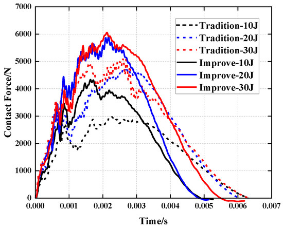 Figure 6 depicts the results of a comparison of simulation and experiment contact force histories under different impact energies, while Table 3 and Table 4 compare simulation and experiment contact force and contact time data. By comparing the data, it can be determined that under the influence of three distinct impact energies, the deviation between simulation and experiment for the peak contact force is within 10%. Simulation and experiment differ in contact time by 0.054 ms, 0.852 ms and 0.516 ms, respectively. The curves of the experiment and simulation can be well fitted. During the experiment, however, due to the unpredictability of the friction between the impactor platform and the slide rail and the impact of external vibration on the equipment, the contact force fluctuated, or the peak value of the force produced errors so that the experimental curve and the simulation curve could not coincide exactly.
