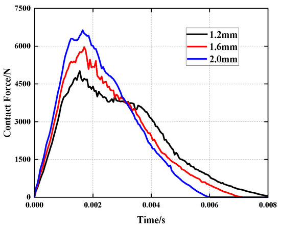 Comparison of the contact force history of the impactor under different face sheet thicknesses.