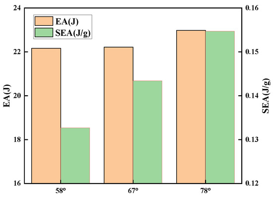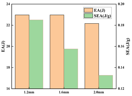 Figure 11 demonstrates the energy absorption and specific energy absorption of sandwich panels with various face sheet thicknesses. The energy absorption characteristics of the overall structure tend to first increase and then decrease as the thickness of the skin grows, but the range of change is modest. The specific energy absorption of the structure decreases rapidly, and the specific energy absorption decreases by 28.31% when the face sheet thickness increases by 0.8 mm. The face sheet that is too thick will raise the structure’s rigidity, which is not conducive to the deformation of the core, hence decreasing the structure’s energy absorption. However, if the face sheet is excessively thin, structural stiffness and impact resistance would be compromised.